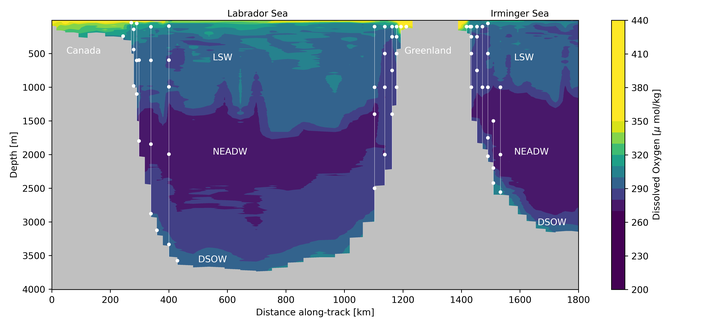 The subpolar North Atlantic is known to be a globally significant gateway for carbon dioxide and oxygen into the deep ocean. At the same time, climate models are unable to reproduce the observed global patterns of oxygen change, hindered largely by a dearth of year-round oxygen observations that target pathways into the interior North Atlantic and their dynamics. This project targets a better understanding of these ventilation pathways through the analysis of an unprecedented six-year moored oxygen time series on the Overturning in the Subpolar North Atlantic Program (OSNAP) across the Labrador and Irminger Seas. Our analysis is organized into three main areas. First, we intend to probe the coupling between ventilation and overturning for dissolved oxygen and inorganic carbon. We hypothesize that convection in the Labrador Sea contributes significantly to ventilation though it does not contribute to overturning strength and variability. Second, we plan to quantify the contribution of direct air-sea exchange within boundary currents to overall ventilation and investigate its sensitivity to freshwater anomalies along the boundary. Finally, we aim to characterize overflow water transformation from the Irminger to the Labrador Sea and identify sources of DSOW oxygen variability. Our interdisciplinary team is well positioned to carry out the proposed work, which includes the recovery of the moored oxygen sensors and their careful calibration, as we have demonstrated through the successful calibration and preliminary analysis of the first two years of observations. The proposed analysis will focus on the dynamics of the ventilation processes, the connections between the Irminger and Labrador Seas, and interannual variability during a time of emerging impact of freshwater on deep convection.